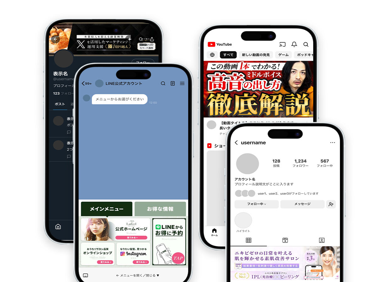 LINE・YouTube・X・InstagramのUIフレームを用意しています。